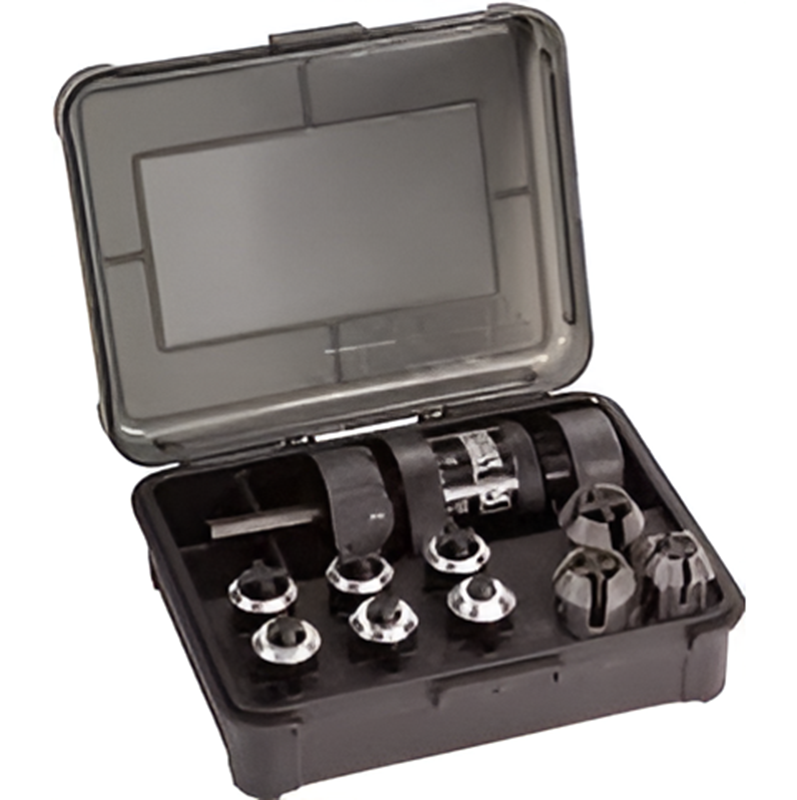 Meegeleverd bij deze Frankford Arsenal Universal hulzentrimmer zijn diverse verstelbare bussen en kragen en het geheel zit keurig in een stevig kunststof koffertje.